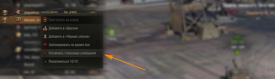 Вы можете отключить передачу голосовых сообщений для каждого конкретного игрока как во время боя, так и в Ангаре. Для этого необходимо щёлкнуть по никнейму нужного игрока правой кнопкой мыши и выбрать опцию «Отключить голосовые сообщения»: