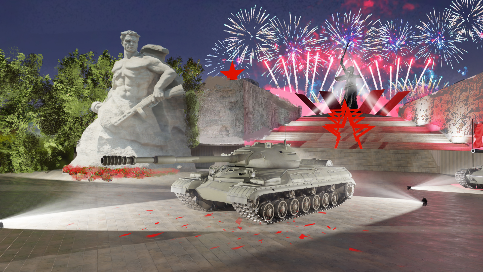 В мемориальном комплексе есть два знаковых объекта, которые мы хотели показать в ангаре — монумент «Родина-мать зовёт!» и площадь Стоявших насмерть. Мы изучали различные варианты размещения танка игрока, и лучшей центральной точкой виделась как раз площадь Стоявших насмерть.