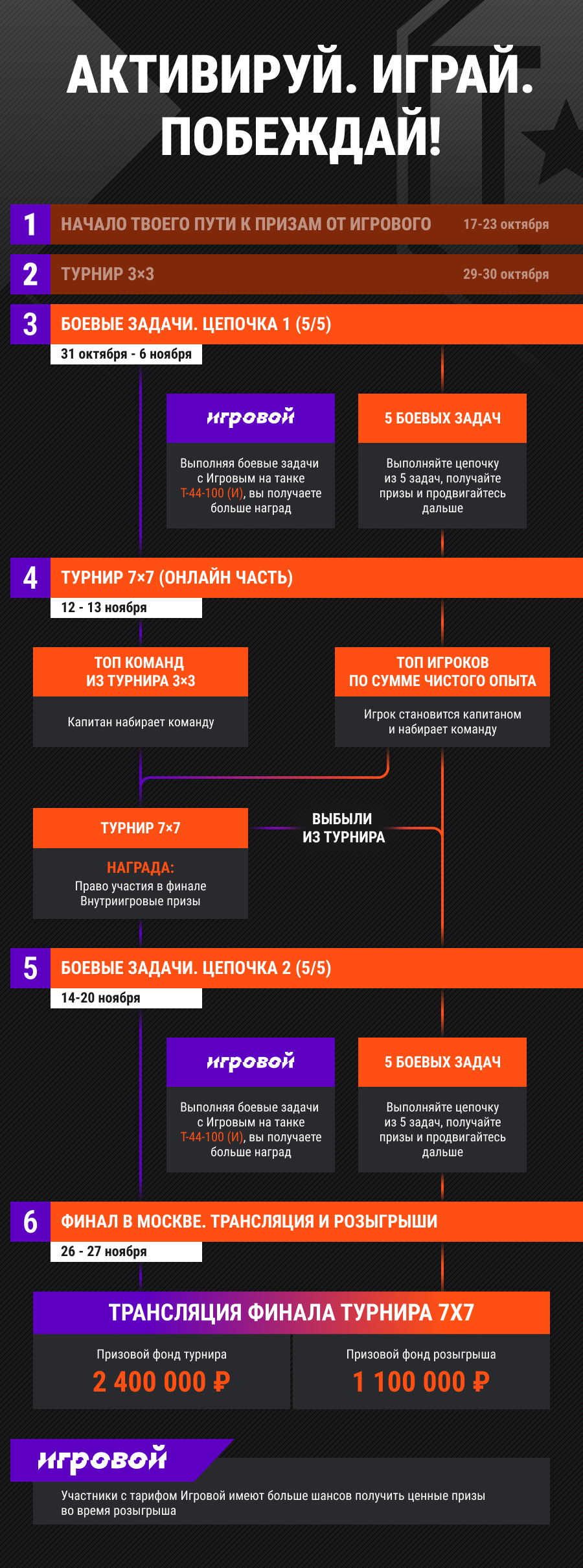 Обратите внимание, что цепочку боевых задач с улучшенными наградами получили только те игроки, которые являлись абонентами тарифа «Игровой» от Ростелекома, t2 или Белтелекома по состоянию на 30 октября 23:59 (МСК). Если вы подключили тариф «Игровой» после указанных даты и времени, то вам будет доступна обычная цепочка боевых задач. Если вы отключите тариф «Игровой» уже после получения цепочки боевых задач с улучшенной наградой, то вы не сможете её завершить, т.к. танк